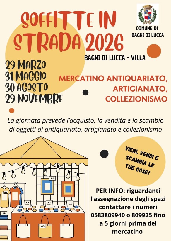 Four times a year Bagni di Lucca has a second hand market, Soffitte in Strada in the piazza in front of Circolo dei Forestieri in Villa. You will find antique and second hand items as well as hand made products.