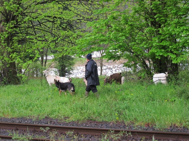 My friend Heather and I were waiting for a train at the Fornoli station the other morning when we spotted a small herd of goats, with their owner and their dog, having breakfast beside the tracks.