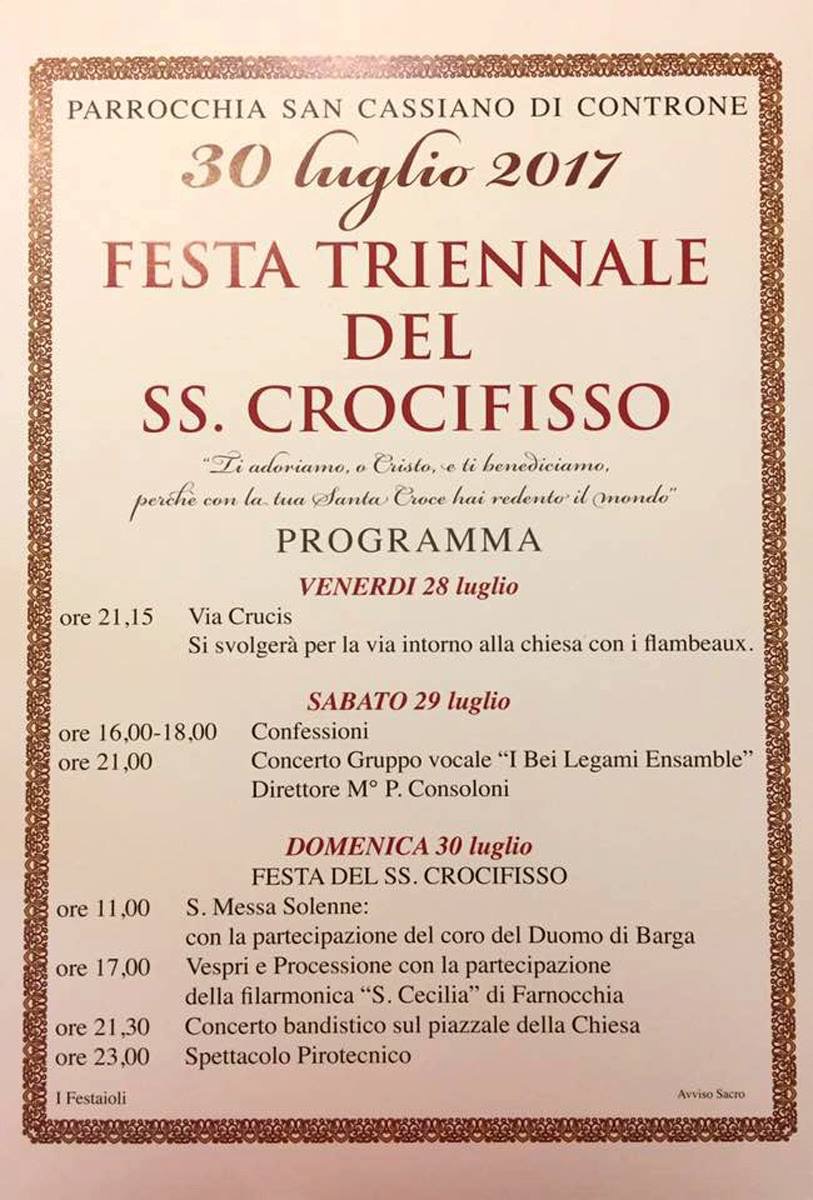 2. Sorry, it looks as if this year it was celebrated in San Cassiano, at least from the flyer, which I overlooked. The two churches have similarities, but I am surprised, because the triennial ceremony has always taken place at San Pietro, as it was the original promise… also, it is a beautiful sight to watch the procession coming down the hill illuminated by candles up to La Villa. Perhaps the parish priest has decided to vary the churches to give more participation….. but I think that they should comply with tradition.