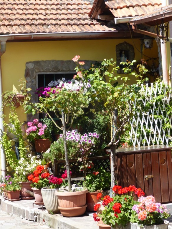 Narrow streets are everywhere, some full of flowers.