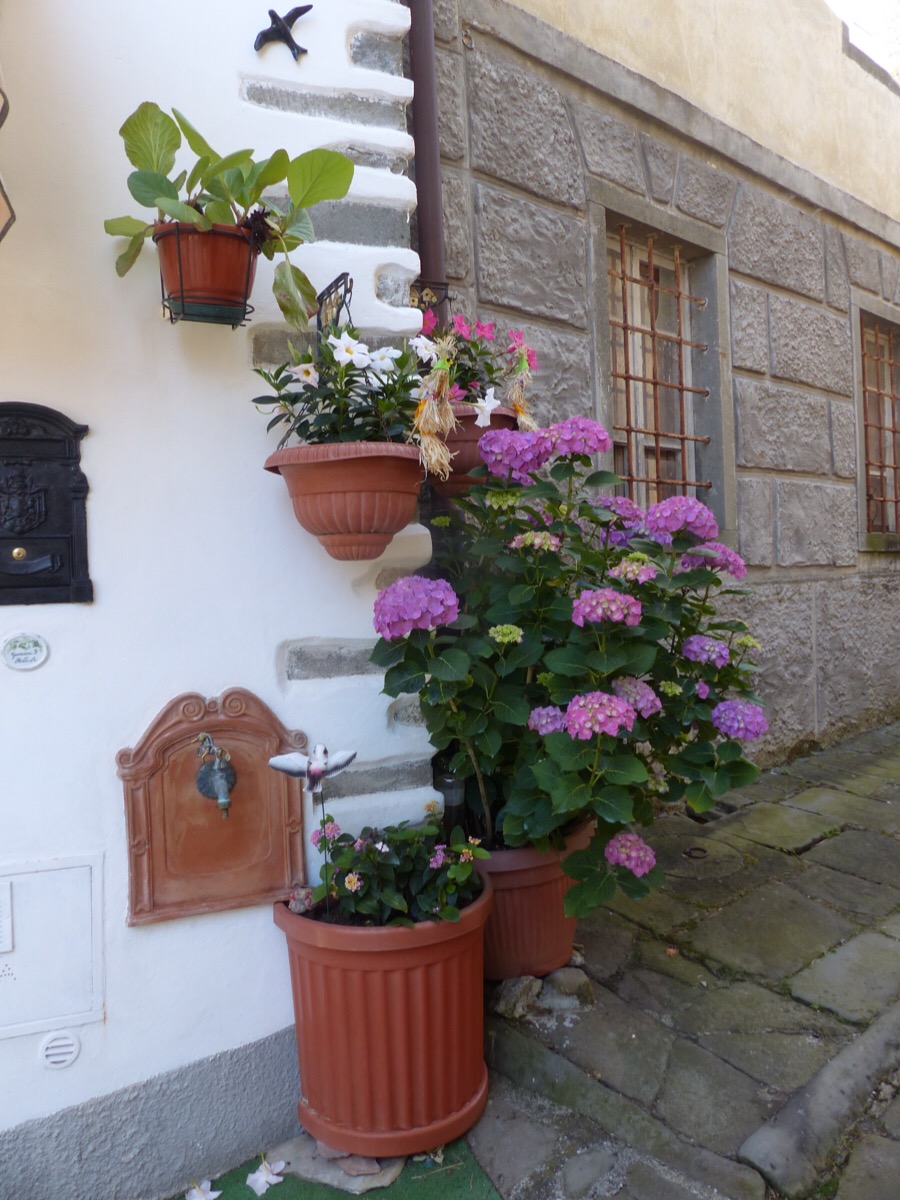 Narrow streets are everywhere, some full of flowers.