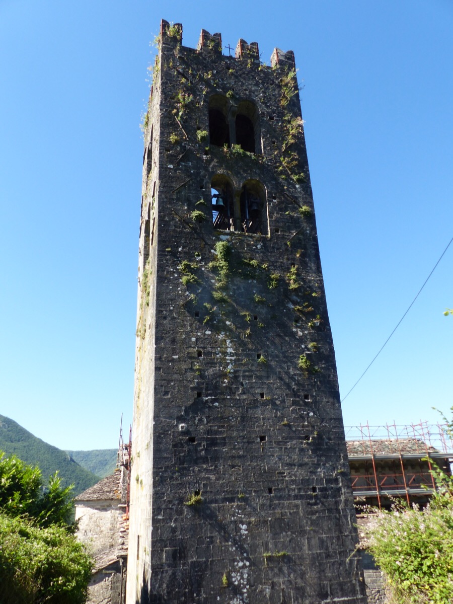 I joined the first walk of the season in Bagni di Lucca in Vico Pancellorum. A small group, together with our guides, gathered and began our walk at the base of the village near the church. It is covered in scaffolding now…here is a photo I took on an earlier visit in winter.