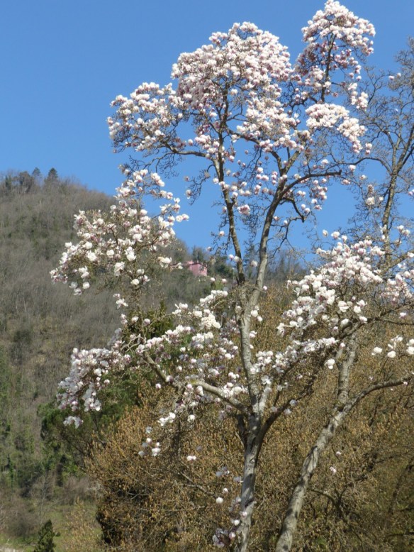 The magnolia trees are in flower right now in Bagni di Lucca. The season is almost over and green leaves are beginning to take the place of the blooms.