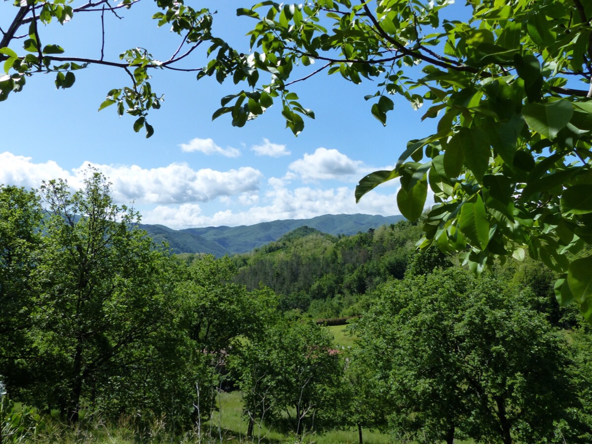 The road down offers glimpses of Lucchio through the trees.